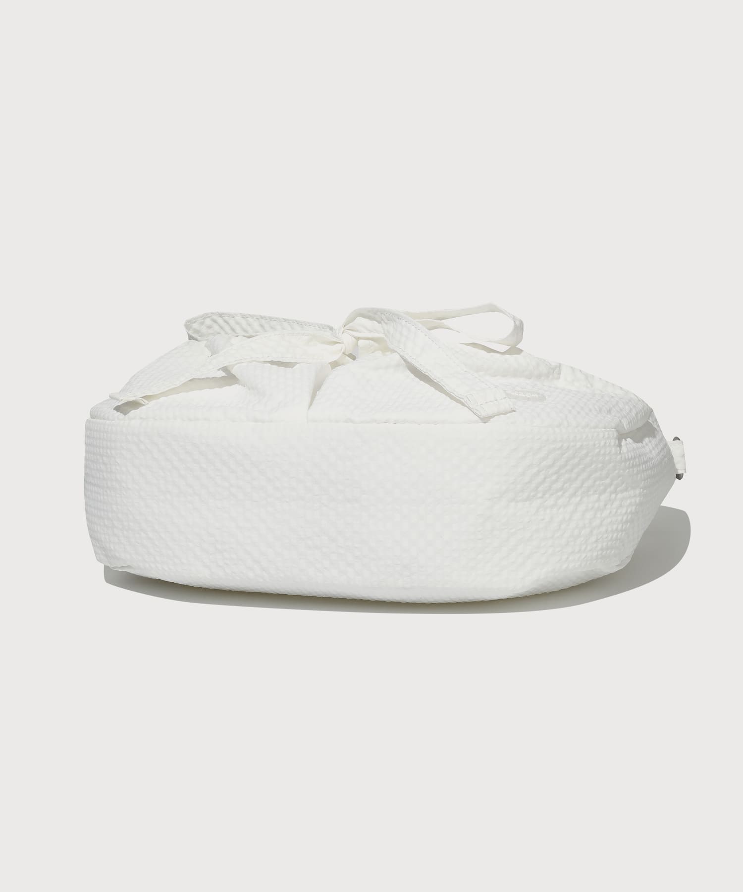 内側オープンポケットやたるみ防止パッドを備え、フロントには透け感のあるロゴ装飾を施しています。