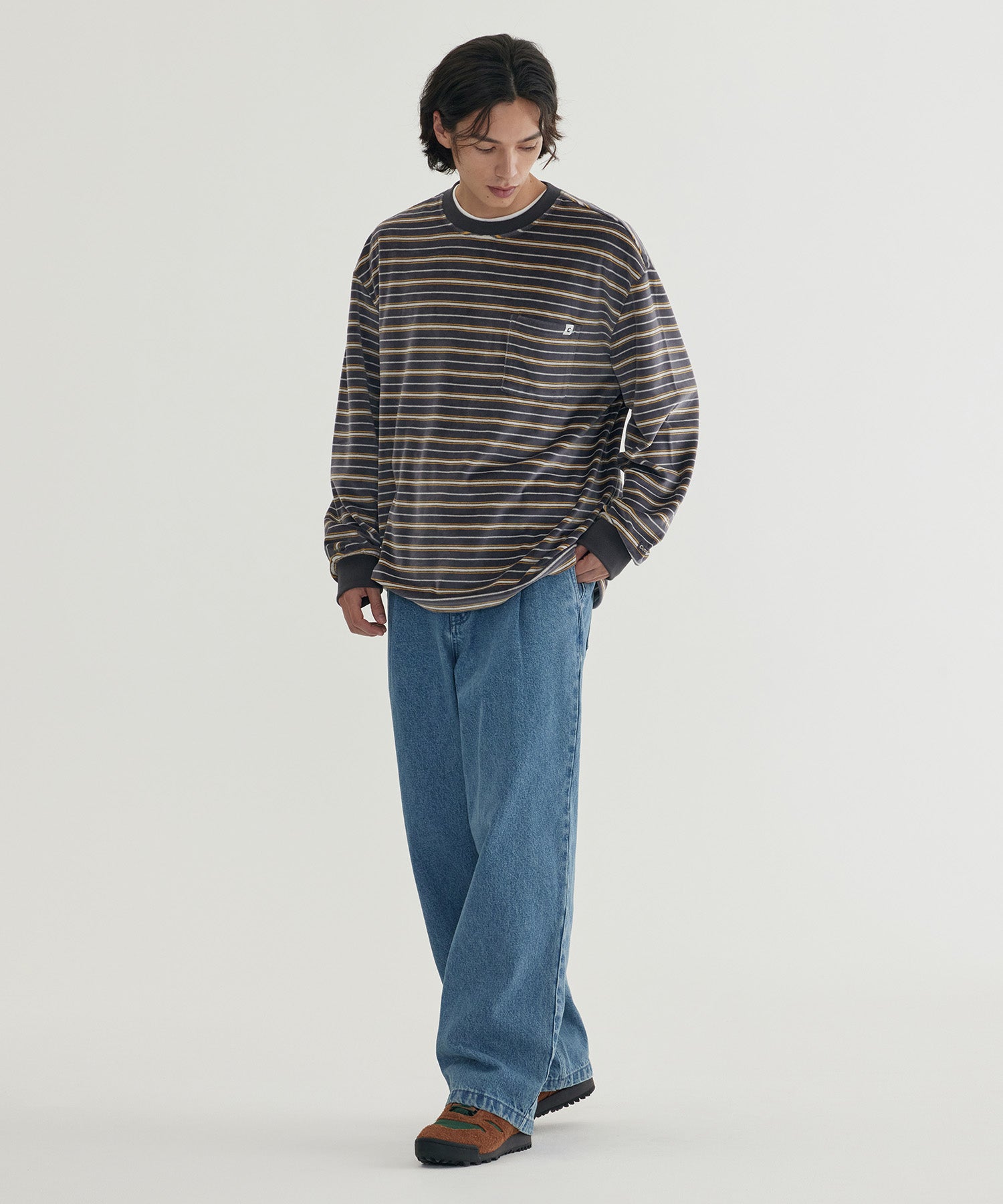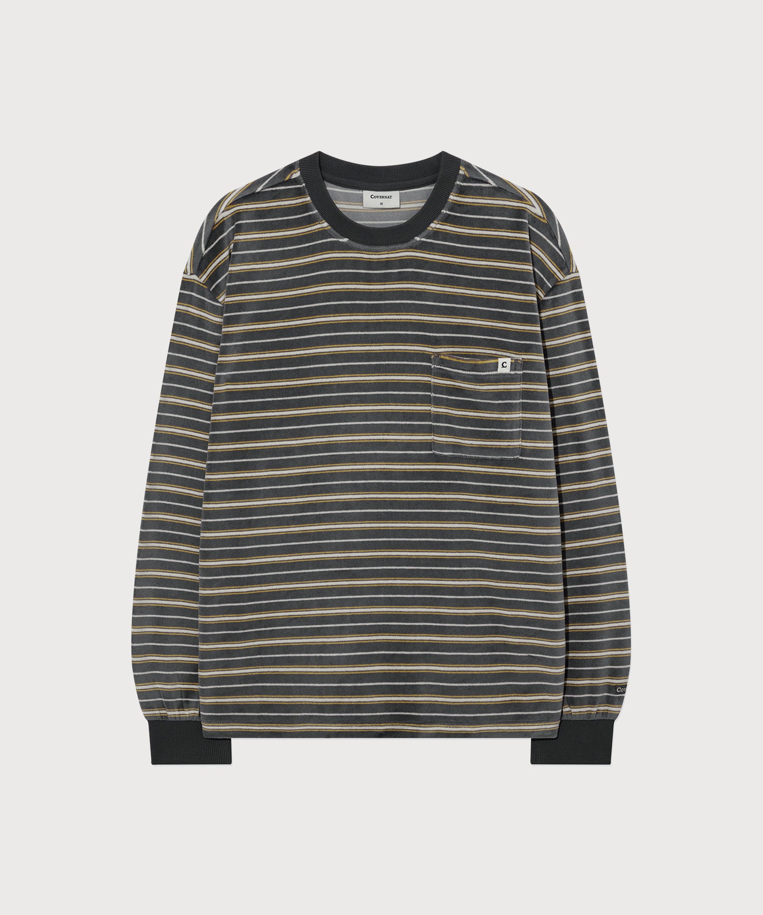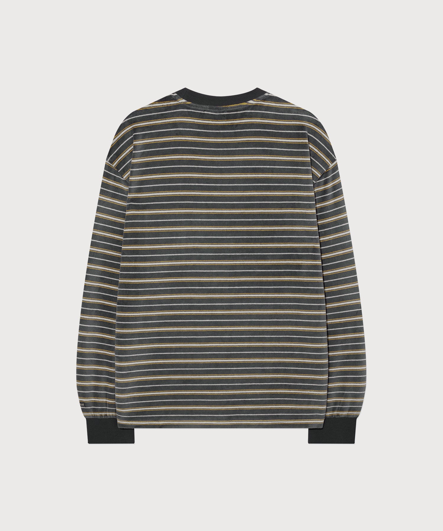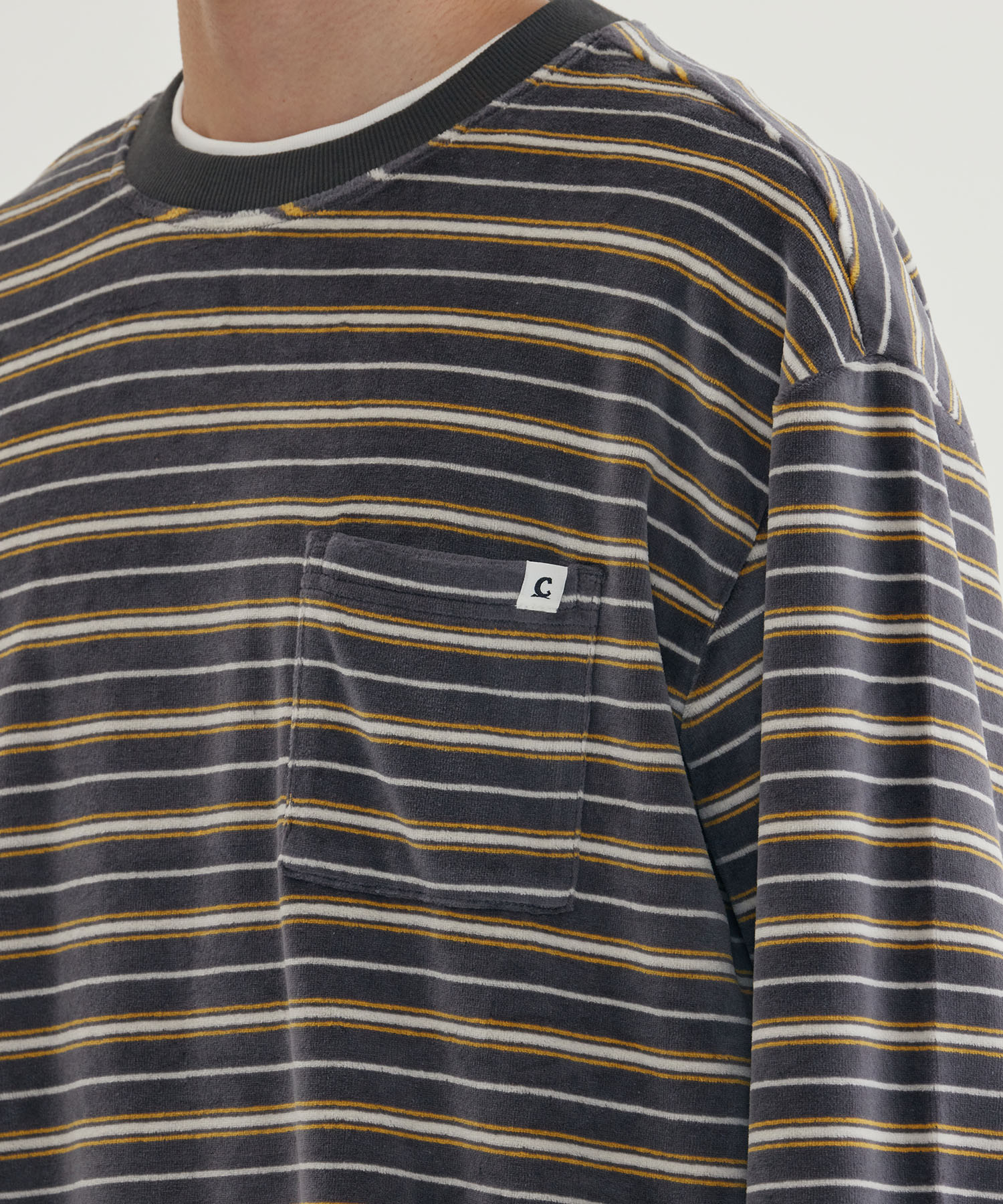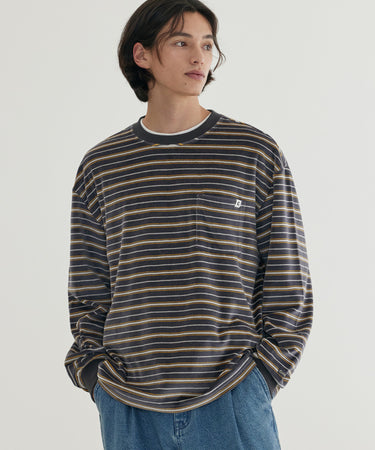 袖にワードマーク刺繍を施し、トレンドカラーのストライプパターンで個性をプラス