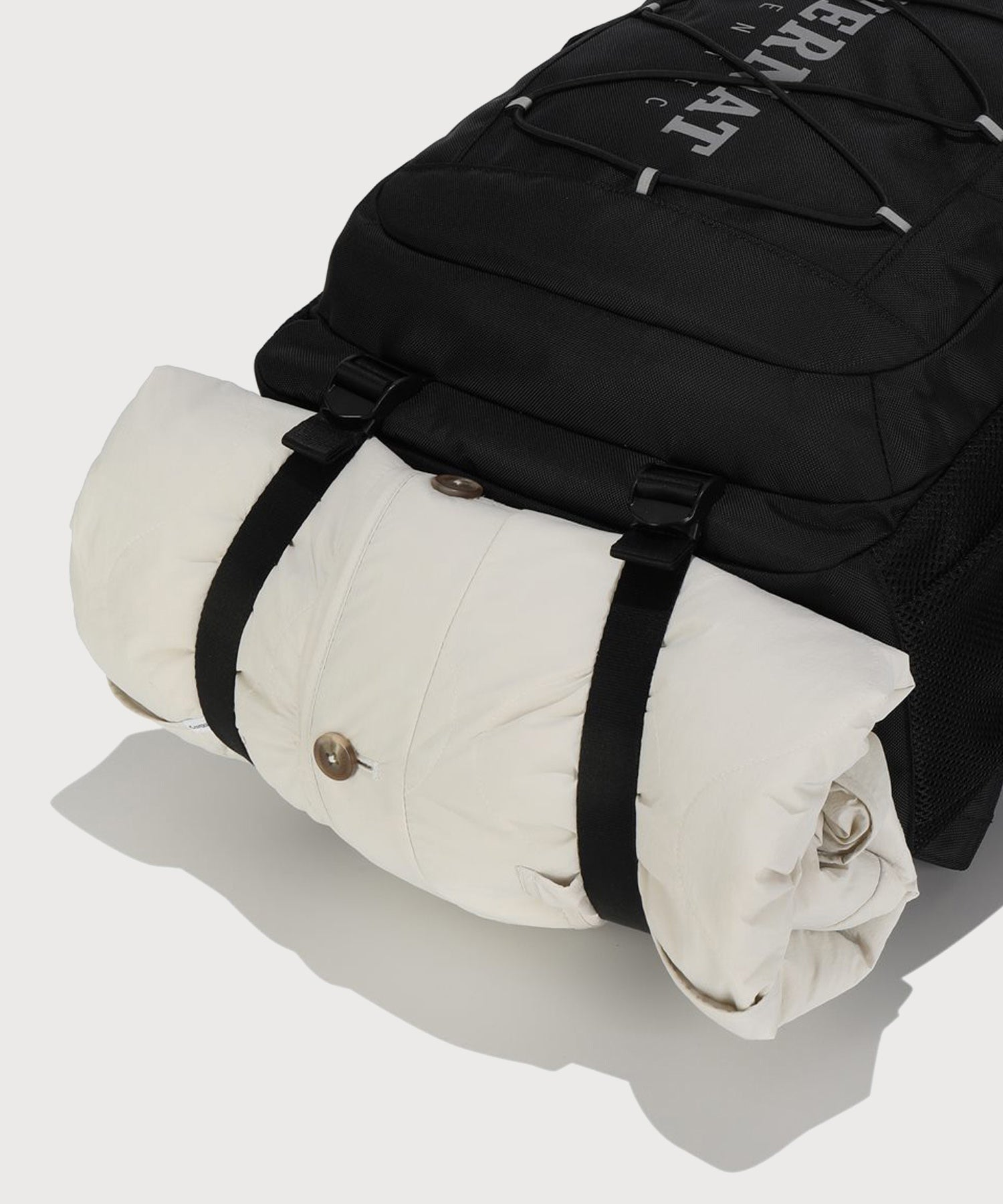 ボトムストラップを使用すれば、アウターなどの追加収納も可能です。